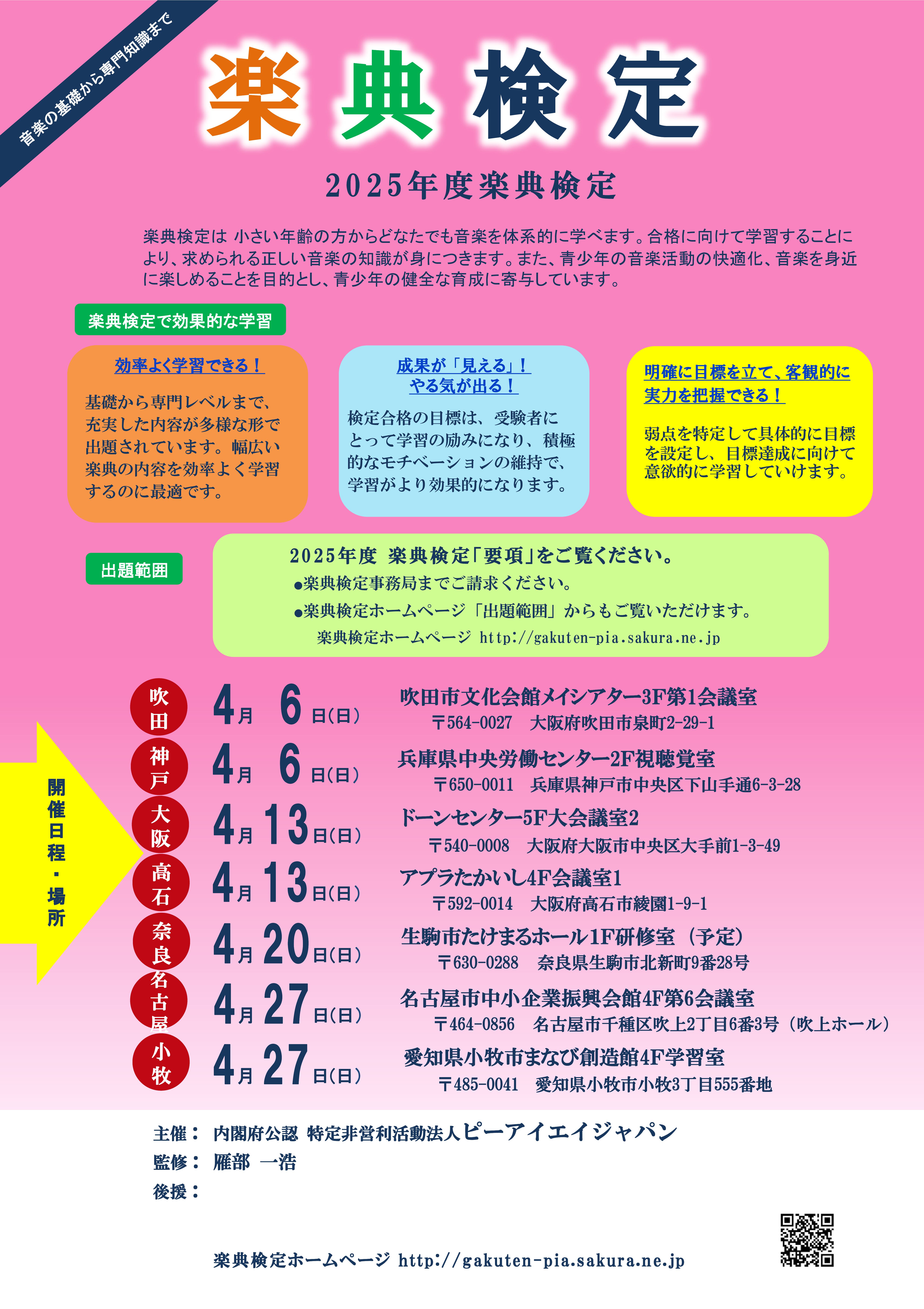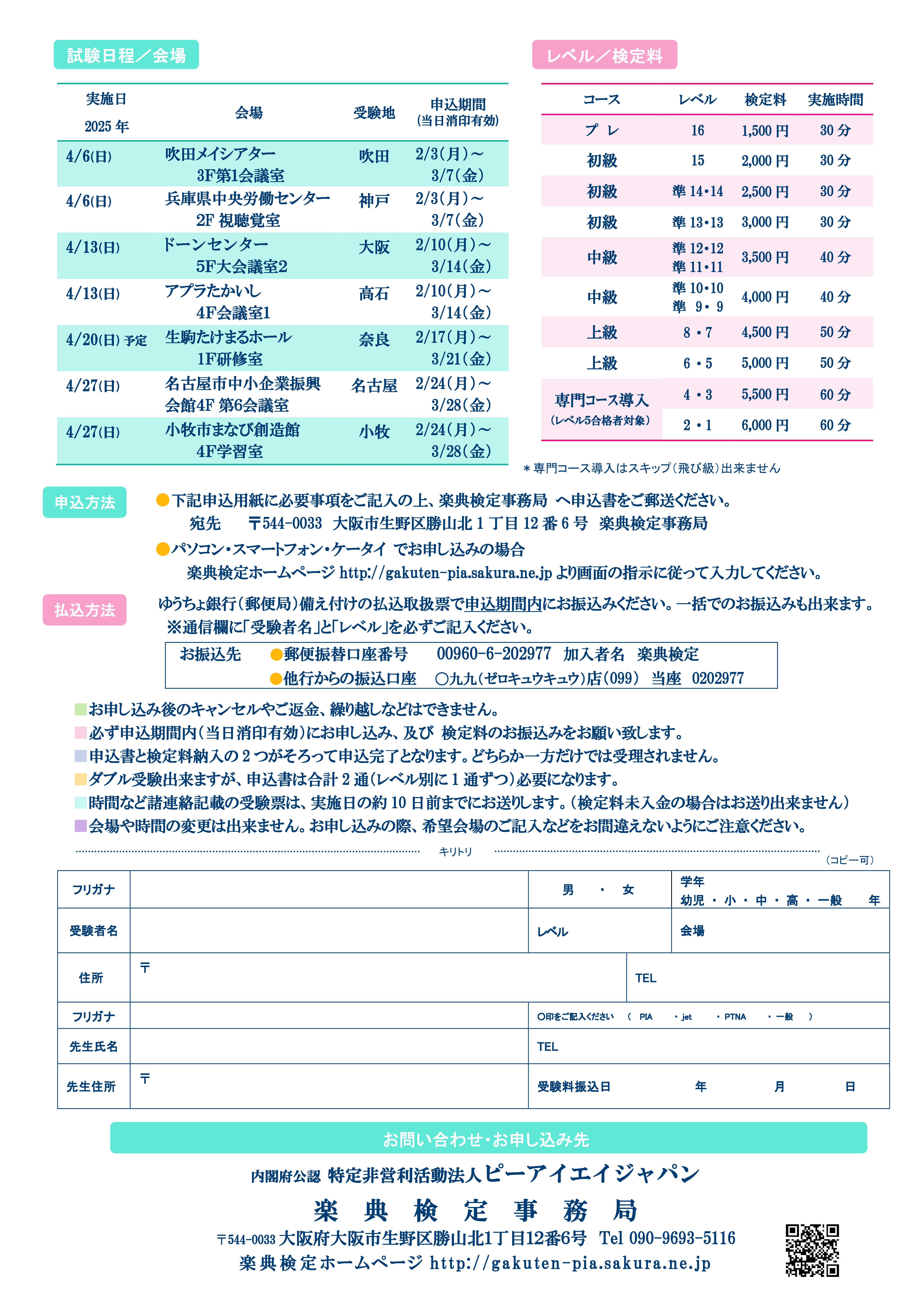 @ チラシにある申込用紙 に必要事項をご記入の上 「楽典検定事務局」へご郵送ください。 |